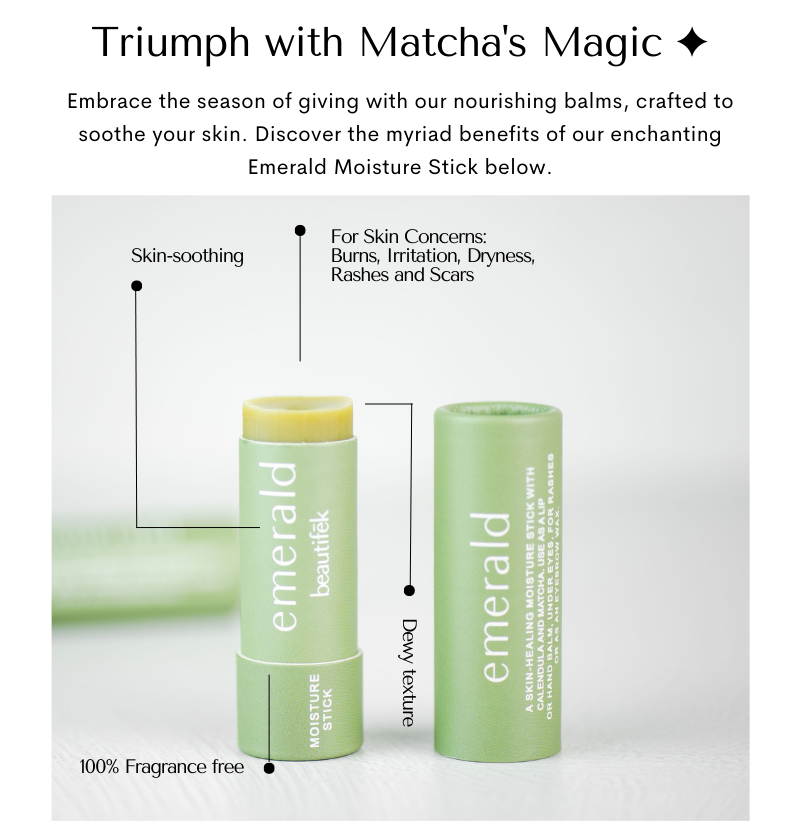 Meet our newest gem-inspired product: Emerald Moisture Stick, a multipurpose balm to heal, soothe, and moisturize skin using calendula and matcha.
